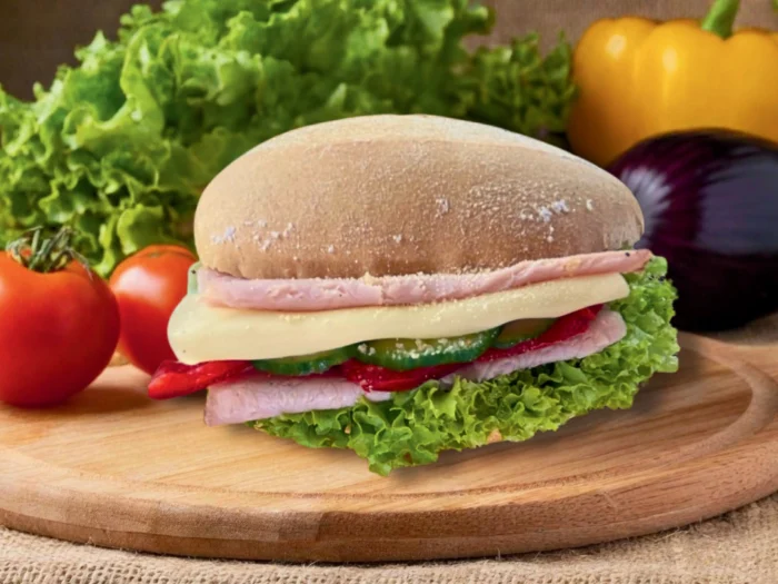 Pyszna, pszenna bułka z plastrami szynki oraz sera, dodatkiem sałaty strzępiastej, ogórka konserwowego oraz świeżej papryki.